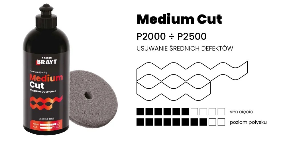 Pasta polerska klasy premium o średniej sile cięcia. Przeznaczona do usuwania średnich zarysowań oraz śladów po papierze ściernym P2000. Unikalna formuła oparta na składnikach najwyższej jakości zapewnia skuteczne usuwanie niedoskonałości, jednocześnie nadając powierzchni wysoki połysk. Produkt nie zawiera wypełniaczy, silikonów ani wosków.